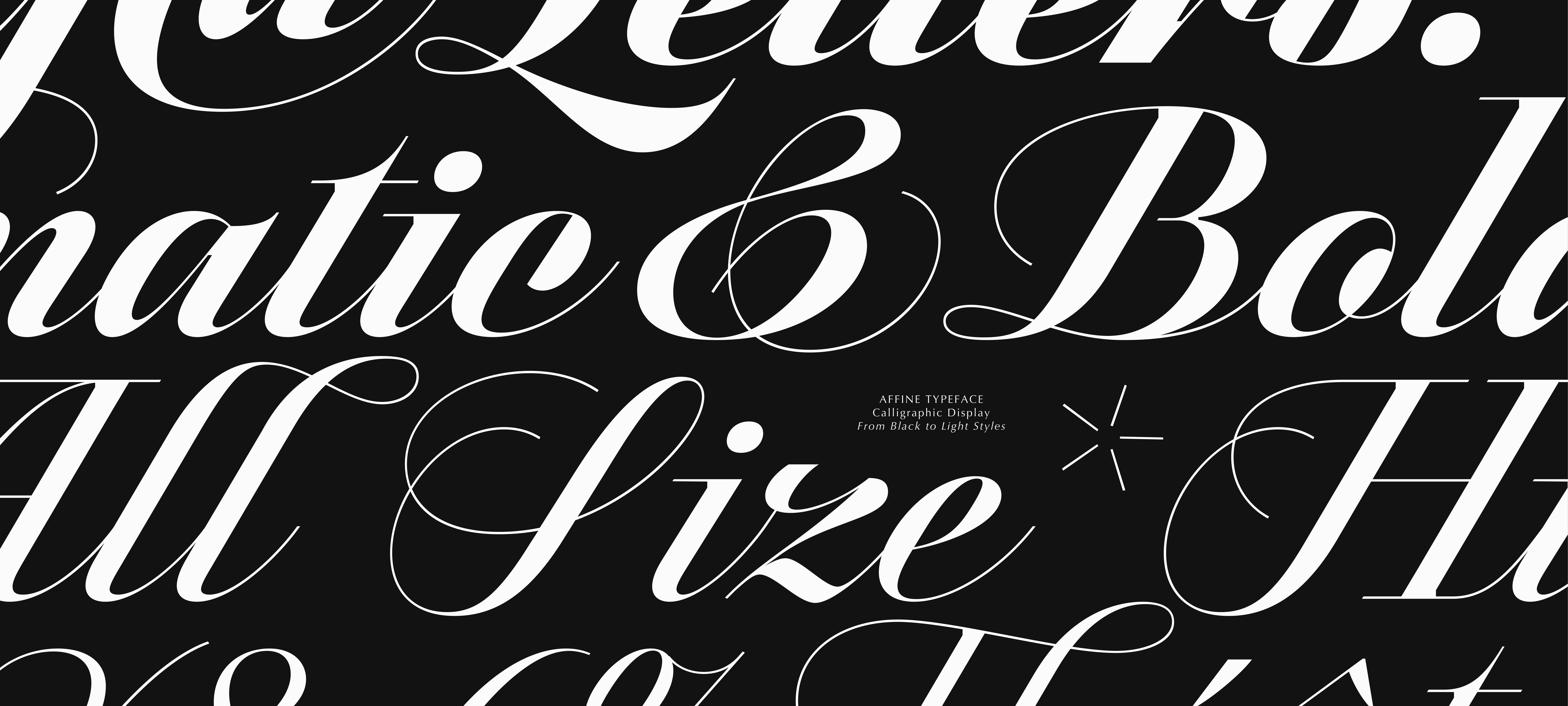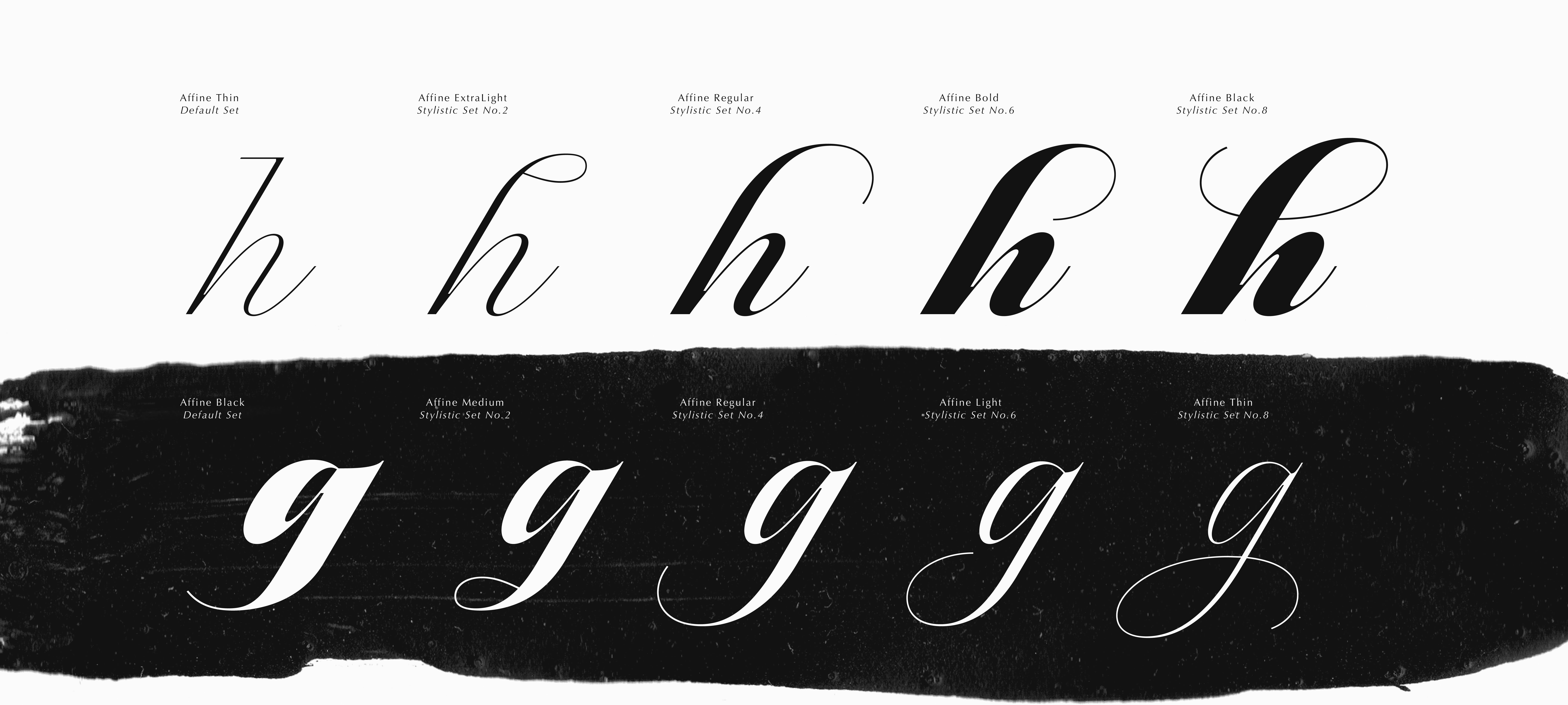 Like any script typeface that intends to reproduce a flowing cursive writing style, Affine requires a set of contextual alternates and OpenType script to ensure smooth connections and uninterrupted pattern between all letters.
